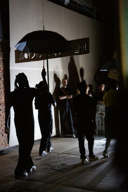Large-scale paintings on plastic allow the performance space to shift between intimate and public configurations. The house built by Dambudzo—a “house of hunger,” or shabini—brings together neighborhood residents who live each minute with zest and abandon. Beauty, love, and violence are spoken in one breath; the street enters the house, and the house is the street.